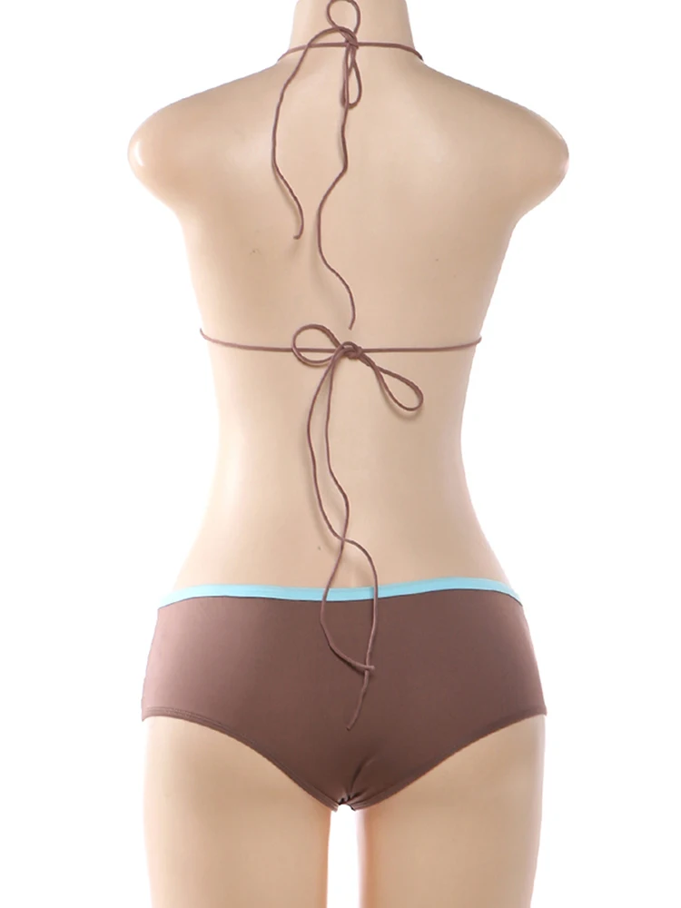 / Kliou Metal Button 2 Piece Set Woman Lace-Up Halter Backless Bra Top+Elastic Waist Shorts Vacation Beach Party Style Bikini Suit